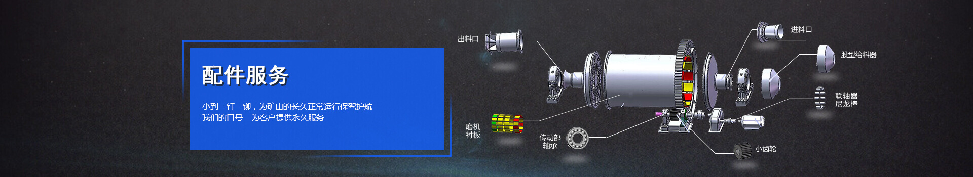 金鵬集團為您提供本公司生產的各種礦山設備的所有配件,型號齊全,性能可靠穩定耐用。 此外快捷的電話、網上詢價,讓您一目了然、一步到位。