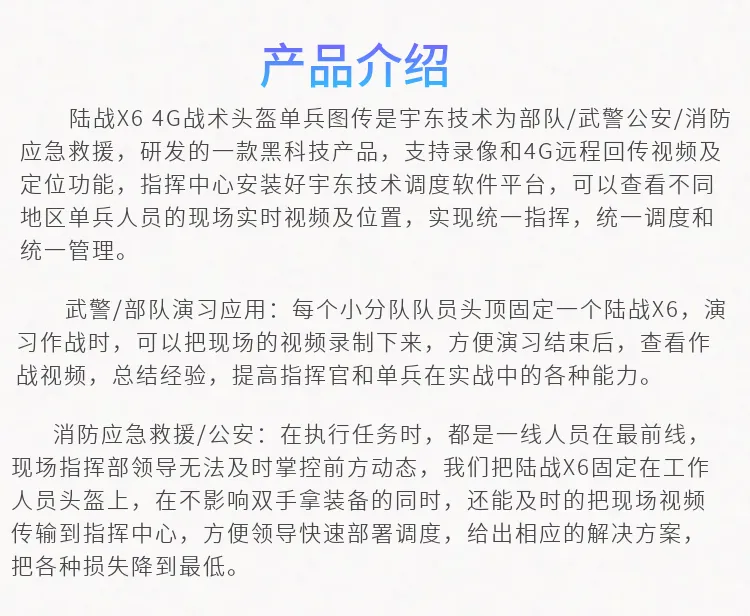 陸戰(zhàn)X6 4G戰(zhàn)術(shù)頭盔單兵無線圖傳是針對武警,特警,移動執(zhí)法取證、行政監(jiān)管等單人便攜式監(jiān)控需求應(yīng)用場景開發(fā)的專用設(shè)備,該產(chǎn)品采用高速處理器和嵌入式Linux操作系統(tǒng),集超低照度彩色攝像機、音頻、4G和Wi-Fi無線通訊模塊、北斗、存儲、報警等模塊,配置高清夜視攝像頭及無線藍牙耳機。設(shè)備可通過4G、Wi-Fi無線網(wǎng)絡(luò)進行實時視音頻信息傳輸、語音對講等功能;協(xié)同后端功能完善的監(jiān)控調(diào)度指揮平臺系統(tǒng)實現(xiàn)針對戶外移動式個體的遠程調(diào)度指揮功能。