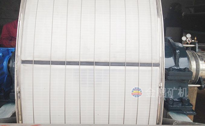 整個筒體外面裹著濾布,為了保證每室之間的密封,濾布用膠條、麻繩或棕繩嵌在隔條的繩槽內。然后再用繞線機構在筒體外面沿軸向以50-80mm的間距纏繞很多道鋼絲,把濾布固定在筒體上。