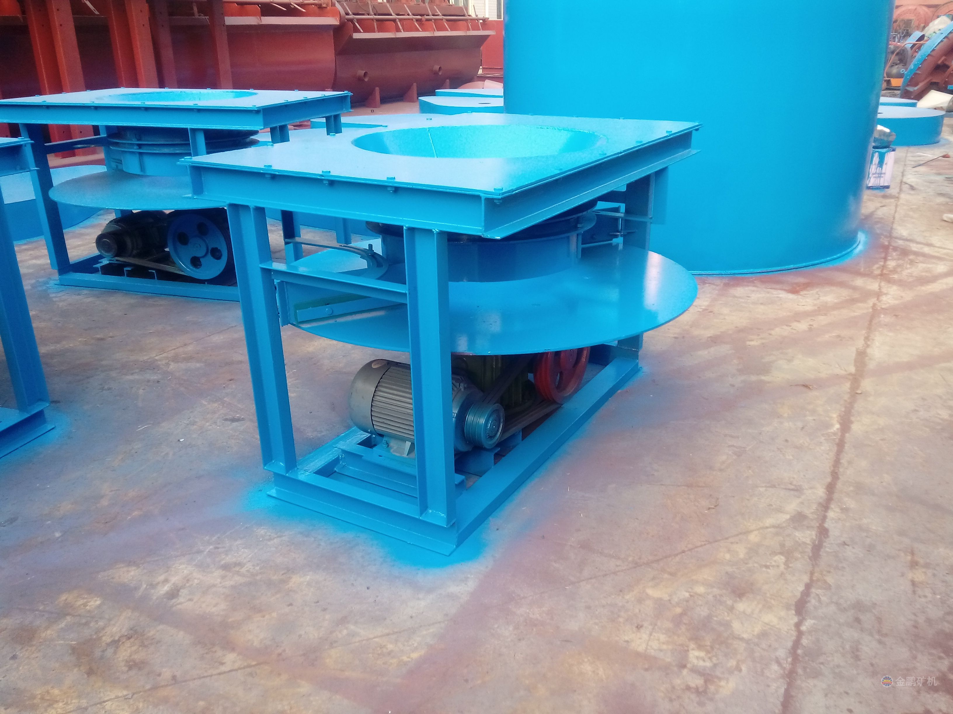 散狀物料從料斗裝入受料筒中,物料沿受料筒壁借本身自重堆積在圓盤上,用調節螺栓調整套筒與圓盤之間的間隙,可以控制物料在圓盤上的自然堆角。圓盤轉動時,物料被圓盤上的卸料刀均勻地刮到圓盤外下落,這樣隨著圓盤轉動,物料便由卸料刀均勻刮入接料斗中。圓盤連續運轉,就完成了均勻的給料操作。調整卸料刀與圓盤之間的間隙,也可以控制給料量的多少。工作時,電動機通過皮帶輪帶動裝在蝸桿減速器上的圓盤轉動。