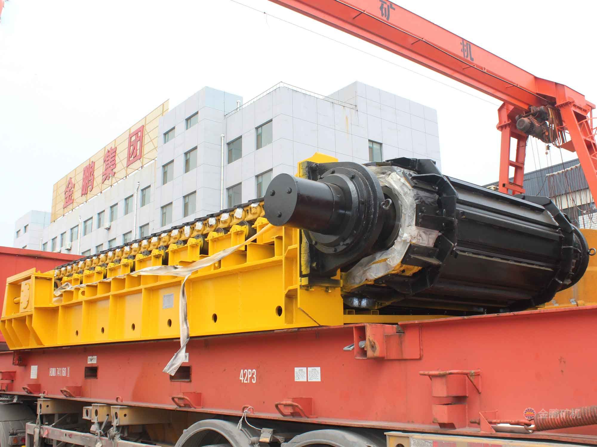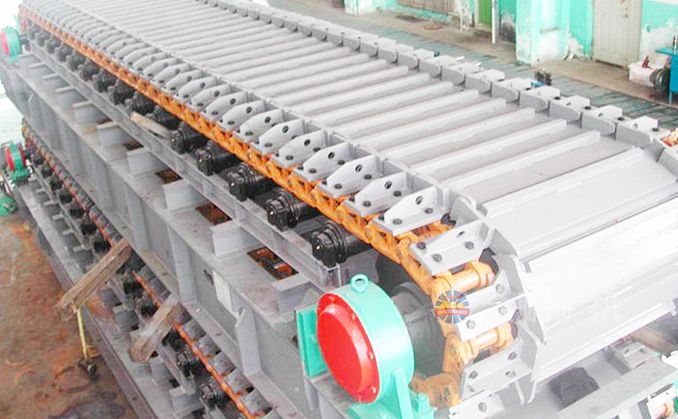 采用節(jié)距為200mm的高強(qiáng)度模鍛鏈條為牽引件,兩根鏈條繞過安裝在機(jī)體頭部的一對(duì)驅(qū)動(dòng)鏈輪和機(jī)體尾部的一對(duì)張緊輪聯(lián)成封閉形回路,在兩排鏈條的每個(gè)鏈節(jié)上裝配了相互交迭的、重型結(jié)構(gòu)的輸送槽而成為一個(gè)連續(xù)的能夠運(yùn)載物料的輸送線路。其自重和物料的重量由安裝在機(jī)體上的多排支重輪、鏈托輪和滑道梁支承。傳動(dòng)系統(tǒng)經(jīng)交流變頻調(diào)速電動(dòng)機(jī)聯(lián)接減速機(jī),再由漲套與驅(qū)動(dòng)裝置直聯(lián)驅(qū)動(dòng)運(yùn)載機(jī)構(gòu)低速運(yùn)行。將尾部料倉卸入的物料沿輸送線路運(yùn)至機(jī)體的前方排出,實(shí)現(xiàn)向下方的工作機(jī)械連續(xù)均勻喂料的目的。